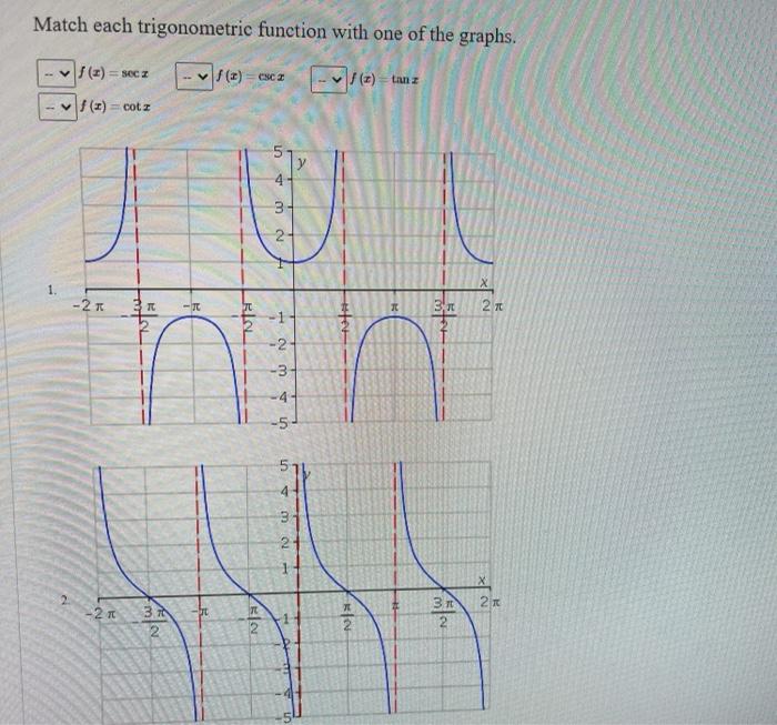 Explore documents and answered questions from similar courses. -2 x 3 3 2 2 y 2 3. Math Calculus QA Library Match each trigonometric function with one of the graphs.