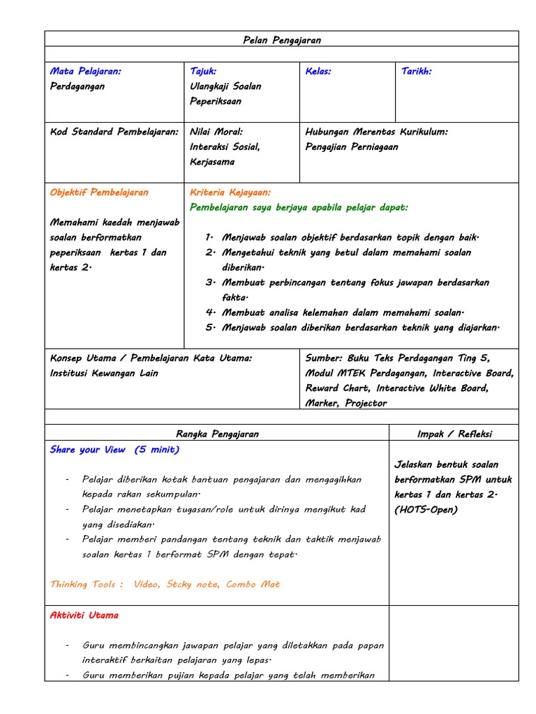 Contoh Rancangan Pengajaran Harian KSSM Tingkatan 2 ERPH. Berikut merupakan koleksi kertas ujian pertengahan tahun untuk sekolah rendah dan menengah. Guru dan murid menerangkan peraturan menjawab soalan dan menyemak kertas soalan.
